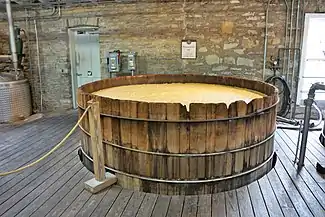 - Når urten er afkølet til ca 25 grader bliver den hældt over på fermenteringstanke som både kan være lukkede ståltanke og helt åbne trækar. Specielt tilpassede gærceller tilsættes - og gæringsprocessen påbegyndes. Gærcellerne omdanner sukkeret til alkohol og kuldioxid (som forsvinder op i luften). Efter 3-5 dage er alkoholprocenten typisk 7-10% og man har nu det der svarer til øl. Producenterne kalder da også denne væske for "Distiller's Beer" (nogle gange også refereret til som "Wash").