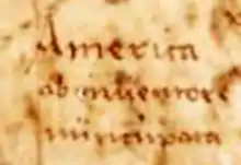 Americus Vesputius var den latiniserede version af den italienske opdagelsesrejsende Amerigo Vespuccis navn, hvoraf fornavnet var en gammel italienskisering (sammenlign moderne italienske Enrico) af det middelalder latinske Emericus (se helgenen Emerica af Ungarn), der stammer fra det oldhøjtyske navn Emmerich, som kan have været en sammenslutning af adskillige germanske navne – Amalric, Ermanaric og det oldhøjtyske Haimirich, fra det urgermanske *amala- ('vigør, tapperhed'), *ermuna- ('stor; velbeholden') or *haima- ('hjem') + *rīk- ('herskere') (sammenlign *Haimarīks).[16]