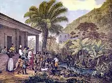 Den første gruppe af den oprindelige befolkning, som mødte Columbus, var de omkring 250.000 fra tainofolket på Hispaniola, øst for Cuba. De repræsenterede den dominerende kultur i Antillerne og Bahamas. I løbet af de næste 30 år var henved 70 % af tainoerne udryddet.[30] De havde ingen immunitet mod sygdommene fra Europa, og udbrud af mæslinger og kopper hærgede befolkningen.[31] Samtidig blev de også straffet for at modsætte sig tvangsarbejde, til trods for tiltag foretaget af encomienda, et formynderskabssystem under den spanske kolonisering for at beskytte arbejdskraften mod andre indianerstammer og samtidig oplære den oprindelige befolkning i den katolske tro.[32] Slavetilværelsen førte til et sidste stort tainooprør. I 1507 var der omkring 60.000 af den oprindelige befolkning, og i 1548 var der færre end 500 mennesker.[33] I 1530'erne kunne spanierne rapportere tilbage til de spanske myndigheder, at der ikke længere fandtes nogen tilbage af tainofolket.[34][35]