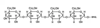 Amyloses struktur vist med fire glukoseenheder. Antallet af glukoseenheder (n) kan være flere tusinde i kæde