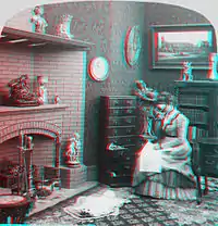 Det ene billede, som er taget mest fra venstre bliver kun vist med røde farver, mens det andet taget længere til højre, kun bliver vist i blå/grønne (cyan) farver. Når man herefter tager et par specielle briller på med rødt venstreglas og cyan højreglas, ser venstre øje kun det venstre billede og højre øje kun det højre billede. Resultatet er, at hjernen genererer et samlet billede med dybde i, som vi kender det fra virkeligheden.