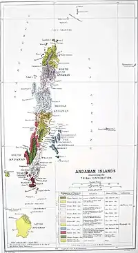 I 1858 kunne man opgøre antallet af stammer på øgruppen. De nordlige områder var beboet af 10 forskellige stammer af "store andamanesere", mens de sydlige dele var beboet af små mennesker, dels Jarawa-folket, dels nogle isolerede stammer på øerne Sentineli og Onge.[2]
