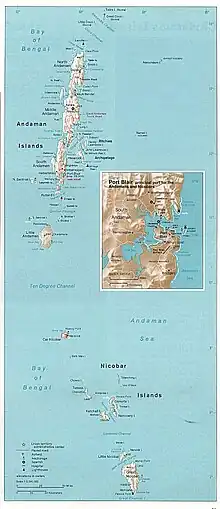 Den sydlige øgruppe er Nicobarerne, som strækker sig ned mod den indonesiske ø Sumatras nordvestlige spids. Den nordlige øgruppe, Andamanerne, strækker sig mod Myanmar. Andamanerne og Nicobarerne er adskilte administrative distrikter i unionsterritoriet.