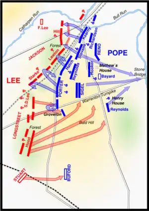 Kort tid efter middag udstedte Pope ordrer til Porters korps, understøttet af Hatch og Reynolds, om at rykke vestpå langs landevejen. Samtidig skulle Ricketts, Kearny og Hooker rykke frem på Unionens højre side. Denne dobbelte bevægelse kunne muligvis knuse den retirerende sydstatshær, men sydstatshæren var ikke i retræte, og håbede ligefrem på at blive angrebet. Lee ventede stadig på en anledning til at modangribe med Longstreets styrke. Selv om han ikke var sikker på, at Pope ville angribe den dag, stillede Lee 18 kanoner under oberst Stephen D. Lee på det høje terræn nordøst for Brawner's Farm, ideelt placeret til at beskyde de åbne marker foran Jacksons stilling.[41]