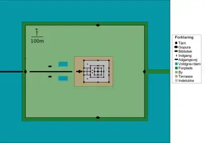 Den ydre mur indeslutter et område på 820.000 m², der udover området med det egentlige tempel oprindelig var bebygget med en by og nord for templet, det kongelige palads. Som alle sekulære bygninger i Angkor var disse bygninger opført af ikke-langtidsholdbare materialer og ikke sten, så bortset fra konturerne af nogle af vejene er der ikke noget tilbage af dem,[17] og det meste af arealet er nu dækket af skov. En 350 m lang adgangsvej med nagarækværk og seks sæt trapper, der leder ned til byen på hver side, forbinder den vestlige gopura til det egentlige tempel. Hver side har ligeledes et bibliotek med indgange i hvert verdenshjørne foran det tredje sæt trapper regnet fra indgangen og en dam mellem biblioteket og selve templet. Dammene og korsterrassen, der vogtes af løver, og som forbinder adgangsvejen med den centrale struktur, er senere tilføjelser.[17]