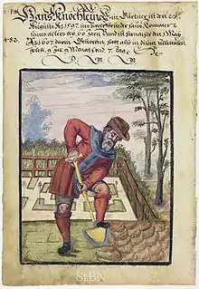 Anlægsgartnerens arbejde er ikke ændret meget over årene. "Broder Hans Knöchlein opgraver med en spade et lille stykke plæne, som grænser op til en barok prydhave med bede, der er omgivet af et hegn."
