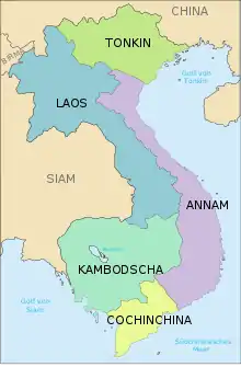 Franskmændene havde håbet på i Mekong at finde en vandvej til det indre Bagindien og Sydkina. Da det imidlertid viste sig, at Mekong kort oven for deltaet spærres af strømhvirvler,[5] begyndte de at vende blikket mod Tonkin.[5] I 1873 sejlede en fransk flotille op ad Songka for at rense Tonkin for sørøvere, og ved en traktat med Amman fik Frankrig ret til at besætte Songkas delta.[3] I 1882 afsendtes en ekspedition til Tonkin, som bemægtigede sig Hanoi. Herved kom Frankrig i krig med friskarer af det gule og sorte flag, fordrevne kinesiske skarer fra Taiping-oprøret, ligesom Kina, på opfordring af kongen af Amman, påberåbte sig sit overherredømme og lod en hær rykke ind i Tonkin. Efter flere nederlag for franskmændene besluttede de sig til at gå energisk frem. Hues søforter ødelagdes af en fransk flåde, og Tonkin erobredes. Den hidtidige hersker, Tu-duk, døde i 1883[5] og blev efterfulgt af Hiep-hoa,[5] som den 6. juni 1884 sluttedes et forlig, hvorved Tonkin blev afstået til Frankrig, og resten af Amman blev fransk vasalstat.[3][5] Officielt var landet fortsat selvstændigt med sin fyrste bosat i Huế,[3] men de annamitiske embedsmænd udøvede deres funktioner under kontrol af fransmænd, som tillige alene forvaltede toldvæsen, offentlige arbejder og andre forvaltningsgrene, som forudsatte samlet ledelse eller anvendelse af europæiske embedsmænd og ingeniører.[4] En fransk generalresident holdt til i Huế med sine medhjælpere og en militær hærstyrke.[4]