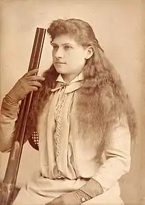 Som teenager deltog hun i Buffalo Bills Wild West Show. Hun blev alment kendt, da hun formåede at besejre skarpskytten Frank Butler. Derefter giftede de sig 23. august 1876.