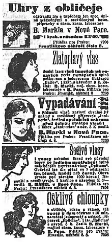 Annoncer for diverse kosmetikprodukter i en avis fra Böhmen (1904).