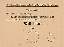 Den foreslåede lovgivning af 13. marts slog fast, at Østrig skulle være en del af Tyskland, og denne lovgivning blev sendt ud til folkeafstemning den 10. april. Historikerne er stort set enige om, at resultatet ikke er manipuleret, men selve gennemførelsen var hverken fri eller hemmelig. Blandt andet blev stemmesedlerne ikke leveret skjult, men kontrolleret af valgfunktionærer. Desuden var stemmesedlen tendentiøst udformet og formuleret. Ifølge nationalsocialisterne skal hele 99,7 % have stemt "ja".[7]