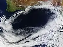Satellitbillede af en anticyclon ved det sydlige Australien i 2012, der viser en rotation om et ovalt område med åben himmel.