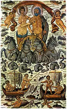 Gud over havet, floder, oversvømmelser, tørke og jordskælv. Han er søn af Cronus og Rhea og bror til Zeus og Hades. Han hersker over et af de tre riger af universet som konge af havet og vandet. I klassisk kunst blev han skildret som en moden mand med kraftig krop med et frodigt skæg holdende en trefork. Hesten og delfinen er hellige for ham. Hans bryllup med Amfitrite præsenteres ofte som et triumftog. Der er nogle historier, der angiver en affære med Medusa, som førte til hendes fødsel af Pegasus fra hendes hals, da Perseus skar hendes hovedet af. Hans symboler er trefork, hest, delfin, fisk og tyr. Hans romerske modstykke var Neptun.  |