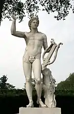 Gud for musik, kunst, viden, helbredelse, pest, profeti, poesi, mandig skønhed og bueskydning. Han er søn af Zeus og Leto og tvillingebror til Artemis. Som bror og søster blev de identificeret med solen og månen; begge bruger bue og pil. I de tidligste myter konkurrerede Apollo med sin halvbror Hermes. I skulpturen blev Apollo afbildet som en meget smuk, skægløse ung mand med langt hår og ideel fysik. Som indbegrebet af perfektionisme kunne han være grusom og ødelæggende, og hans kærlighedsforhold var sjældent lykkelige: Et eksempel var hans frugtesløse forfølgelse af skovnymfen Daphne. Med sit store ego gjorde han Eros (Amor) vred, og han blev skudt med en pil af kærlighed og Daphne med et pil af had. Nymfen blev forvandlet til en laurbærbusk for at undslippe Apollo, der er helt optaget af hende, mens hun hader ham af hele sit hjerte. Det får Apollo til at tilbede træet. Hans attributter er laurbærkrans og lyre. Han optræder ofte i selskab med muserne. Hans hellige dyr er rådyr, svaner, cikader, høge, ravne, krager, ræve, mus og slanger.  |