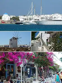 Fra øverst til venstre: Havnen i Antiparos, vindmøller, traditionelle huse i borgen og handelsgaden