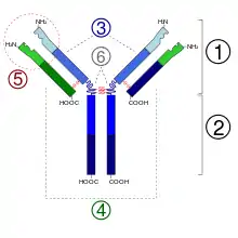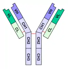 Immunoglobulin G, IgG, ofte benævnt “monomer” selvom molekylet har to identiske halvdele med tilsammen to identiske bindingssæder for antigen. Et molekyle IgG består af to lette kæder (L, korte kæder) hver med et variabelt domæne, V, og et konstant domæne, C, og to tunge kæder (H, lange kæder) hver med et variabelt domæne, V, og tre konstante domæner, C. De lette og tunge kæder er bundet sammen af S-S-broer.