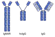 Camelider, dvs kameler, dromedarer, lamaer og guanacoer, er enestående blandt pattedyrene ved at have immunglobuliner, hcIgG (hc for heavy chain), der kun består af to tunge kæder, hver med kun tre domæner, et variabelt domæne og to konstante domæner.[2]