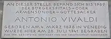 Vivaldis liv endte, som for mange andre komponister på denne tid, med økonomiske bekymringer. Hans kompositioner var ikke længere ligeså populære i Venedig, som de tidligere havde været. Den musikalske smag forandredes, og de blev umoderne. Vivaldi måtte sælge en stor del af sine manuskripter for ubetydelige beløb for at finansiere en flytning til Wien. Årsagen til at Vivaldi forlod Venedig er uklar, men antagelig ville han komme i kontakt med kejser Karl VI, som havde vist så stor interesse for hans musik, og håbede at blive ansat ved det kejserlige hof.[32] På rejsen fra Venedig er det troligt, at han opholdt sig i Graz for at møde Anna Giro.[33] Endnu mere troligt er, at hovedårsagen til rejsen til Wien var at opsætte nogle operaforestillinger, især da hans bolig lå nær Kärntnertortheater. Kort efter Vivaldis ankomst til Wien døde kejseren imidlertid den 20. oktober 1740, blot 55 år gammel. Det blev et hårdt slag for Vivaldi, som nu var uden beskyttelse og indkomst. Året efter, natten mellem den 27. og 28. juli 1741, døde Vivaldi.[34] Vivaldi befandt sig ved sin død i den bolig, han lejede af enken efter en sadelmager. Årsagen var en "indre infektion". Den 28. juli blev han begravet i en enkel grav på sygehusets gravplads. Jordfæstelsen skete i Stefansdomen (hvor den unge Joseph Haydn da var kordreng). I prisen for begravelsen indgik klokkeringning for fattigbegravelse.[35] Både rapporter fra samtiden og senere forskning bekræfter, at Vivaldi døde ludfattig.[36] Han blev begravet i nærheden af Karlskirche i Wien, dér hvor Technische Universität nu ligger. Huset, han boede i, mens han var i Wien, er revet ned - det lå der, hvor Hotel Sacher senere blev opført. Mindeplaketter er sat op begge steder.