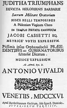 I samme periode bestilte Pietà flere liturgiske værker. De mest betydningsfulde var to oratorier. Det ene, Moyses Deus Pharaonis (RV 643), er gået tabt og det andet, Juditha triumphans (RV 644), som blev komponeret i 1716 med stof fra Judits bog i anledning af venetianernes sejr over tyrkerne og generobringen af øen Korfu i august samme år, er et af hans kirkelige mesterværker. Alla de 11 sangroller, både de mandlige og de kvindelige, fremførtes af piger fra Pietà. Mange af arierne indeholdt også instrumentale soloer for blokfløjter, oboer, viola d'amore og mandolin, hvilket viste pigernes brede musikalske færdigheder.[26]
