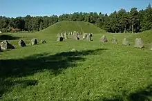 For foden af gravhøjen er der to store skibssætninger, der er placeret i forlængelse af hinanden, og de er henholdsvis 51 m og 54 m lange.[3] Der har været tingsted på området og skibsætningerne bliver associeret med denne funktion.[4]