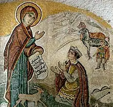 Mosaik der viser Jomfru Maria, der holder en arabisk tekst. Fra et kloster i Sednaya, Syrien