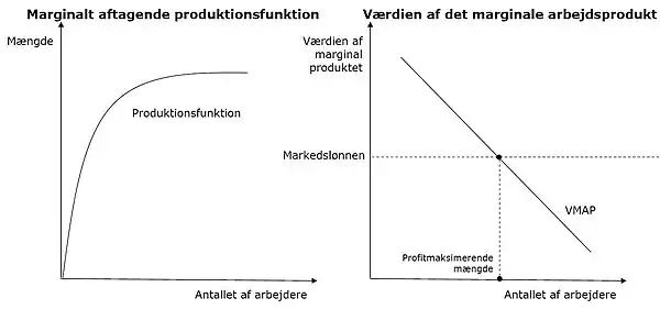 Udgangspunktet for en virksomhed er dennes produktionsfunktion, hvor den producerede mængde er en funktion af antallet af ansatte arbejdere. Det antages her typisk, at det marginale arbejdsprodukt (MAP) er aftagende ved ekstra arbejdere. Værdien af dette marginalprodukt (VMAP) fremkommer ved, at prisen P (fastsat eksogent på varemarkedet) ganges på marginalproduktet, så VMAP = P x MAP. Virksomhederne vil ansætte arbejdere, hvis værdien af deres marginalprodukt er over deres løn (W), omvendt vil de fyre arbejdere, hvis deres løn er over værdien af deres marginalproduktion. Det betyder, at vi i ligevægten får W = VMAP = P x MAP. Da markedslønnen er givet for den enkelte virksomhed får vi altså, at det profitmaksimerende antal arbejdere er givet ved følgende figur: