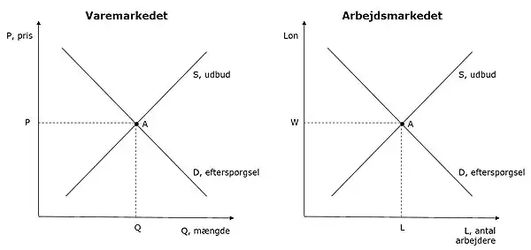Heraf kan den faldende efterspørgselskurve på arbejdsmarkedet også udledes (da lavere markedsløn her klart betyder større efterspørgsel og omvendt). Den stigende udbudskurve er derimod mere naturlig, og bunder i, at alternativomkostningerne ved at arbejde er at holde fri. Der er et trade-off mellem arbejde og fritid. Herved kan vi altså opstille følgende to udbuds- og efterspørgselsdiagrammer: