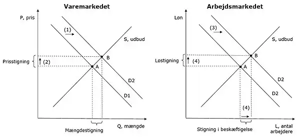 - 2) Arbejdetsefterspørgslen, som bliver større. Herved vokser beskæftigelsen samtidig med at lønnen stiger.