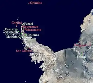 | Marambio | 1969 | Permanent | Antarktiske halvø – Seymour Island |