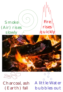 Aristoteles forklarede gravitation med, at alle legemer søger imod deres naturlige sted. Elementerne jord og vand hører til i midten af universet,[1] hvor vandet er i en koncentrisk sfære om jorden. Derfor synker jord i vand. Oven på vandet er der en koncentrisk sfære af luft, da luftbobler i vand stiger opad. Helt øverst er ild, der dog er under de himmelske sfærer.
