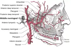 ![]() Illustration af arterier på siden af kraniet. Arteria meningea media kan ses dykke ind under tindingebenet, markeret med "middle meningeal". | |