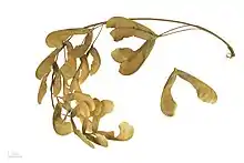 Bladene er uligefinnede med ægformede småblade. Randen er ujævnt tandet. Oversiden er lysegrøn og glat, mens undersiden er mere grålig. Bladstilken er gul til lyserød. Høstfarven er gul. Han- og hunblomster findes på forskellige træer. Hanblomsterne sidder i hængende bundter, som ses før løvspring. Hunblomsterne findes i endnu længere bundter. Frugterne er vingede spaltefrugter med indadkrummede vinger. Spiredygtige frø ses næsten aldrig her i landet.
