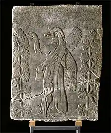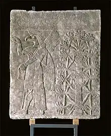 Ånden (måske akkadisk: apkallu, sumerisk: ab.gal) er af samme type som de statuetter, som man begravede under gulvet for at afværge onde magter. Her er den magiske figur kastet op på paladsvæggen for at vogte det stiliserede træ, som var et billede på landets frugtbarhed. Hornene på træets stamme bliver ligeledes brugt til at beskytte det stiliserede træ.