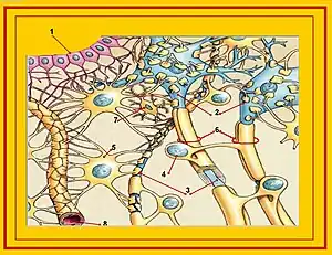 Yderligere danner disses udløbere et tæt lag under pia mater (den inderste hjernehinde), ependymet og hjernens kapillærer. Omkransningen af kapillærene danner den såkaldte blod-hjerne-barriere hos laverestående dyrearter, mens den hos højerestående dyrearter (som mennesket) forstærker den, ved at vedligeholde de tætte cellulære bindinger mellem blodkarcellerne.[3]