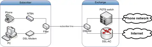 Et ADSL modem, kaldet ADSL Transmission Unit Remote (ATU-R), placeres hos brugeren, og dette er ansvarligt for at signalet bliver splittet i omtalte 3 kanaler. På udbyderens central findes et andet ADSL modem, kaldet ADSL Transmission Unit Central (ATU-C), som modtager signalet på de 3 kanaler fra ATU-R enheden. ATU-C enheden sørger for at sende baseband signalet videre gennem det normale telefonnet, mens downstream og upstream kanalerne sendes videre til en Digital Subscriber Line Access Multiplexer (DSLAM) enhed. Denne kombinerer flere ADSL signaler og transmitterer dem over udbyderens fiberoptiske kabler via f.eks. ATM (Asynchronous Transfer Mode).