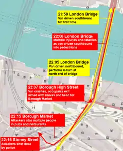 Attentatet i London 3. juni 2017 fandt sted kl. 22:08 lokal tid ved, at en varebil kørte ind i en folkemængde på London Bridge, hvorpå tre gerningsmænd forlod bilen og knivstak flere personer.