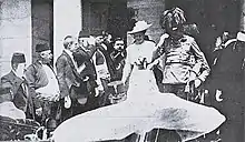 Ærkehertug Franz Ferdinand og hans gemalinde på trappen til rådhuset i Sarajevo. Fem minutter senere blev de myrdet.
