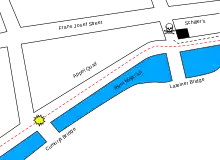 Stedet for bombeanslaget (gul stjerne) og nedskydningen (dødningehovedet)