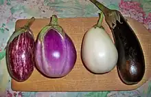Auberginer findes i mange forskellige sorter, der giver vidt forskellige frugter. Den mest kendte i Danmark er den violette variant – hvis farve også kendes som auberginefarvet.