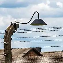 Auschwitz I-koncentrationslejren: Fangebygning 11, hvor man udførte tortur og henrettelser. Til højre: Elektrisk pigtrådshegn som gør flugt umulig.