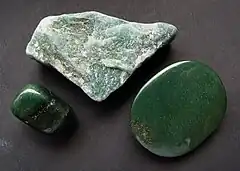 ![]() Aventurin: Øverst den rå sten, nederst til venstre en tromlepoleret sten, nederst til højre en sten med cabochonslibning | |