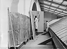 Axel Johansen (tv.) tegner på kartonen til freskoerne til Thorvaldsens Museum - 27. januar 1914