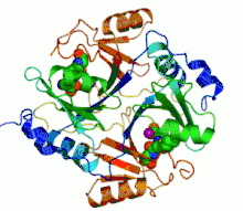 Humant glyoxalase I vist som bånddiagram. En oversigt over de forskellige motiver benyttet i bånddiagrammer er vist i skemaet herunder.