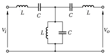 Et medium-komplekst eksempel af et båndpasfilter. Det skal bemærkes, at signalgenerator (indgangs-) og udgangs-impedans har stor betydning for overføringsfunktionen og derfor også burde være tegnet med.