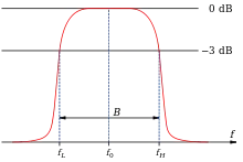 Båndbredde målt ved halv-effekt punkter (forstærkning -3 dB, √2/2, eller omkring 0,707 relativ til spids/top) på et diagram som viser signalstyrke overføringsfunktion som funktion af frekvensen for et båndpasfilter.