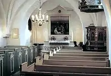 Den brede korbue til det oprindelige kor er bevaret. I forbindelse med ombygningen i anden halvdel af 1400-tallet fik kirken indbygget krydshvælv. Alterbilledet er malet af Th. Wegener i 1862. Prædikestolen er skåret af Bertel Snedker i 1604. Vestpulpituret er fra 1638, i felterne er opsat figurer, som formodentlig stammer fra en sengotisk altertavle.