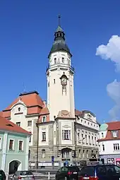 Rådhuset er et hovedvartegn for Mírové-pladsen i den historiske bymidte. Det er en jugendstilbygning, bygget i 1908-1911.[2] Mariasøjlen og springvandet på pladsen er fra anden halvdel af 1600-tallet.[3]