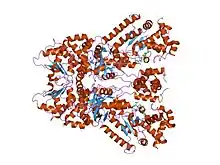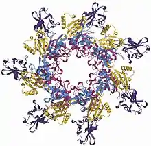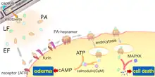Anthrax toksin er et exotoksin af formlen A2B og består af et kompleks af tre proteiner, to enzymer, EF (forkortelse for edema factor) og LF (forkortelse for lethal factor) og en cellebindende komponent PA (forkortelse for protective antigen), se billedet. Ved infektion danner syv PA-enheder en pore i cellemembranen og via endosomer internaliseres EF og LF, der begge forstyrrer den normale biokemiske ligevægt i cellen bl.a. signaltransduktionen førende til apoptose (celledød), se en:Anthrax toxin.