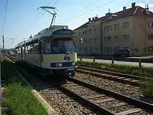 I Guntramsdorf kører banen som sporvogn gennem Feldgasse. Da den imidlertid retmæssigt kører som jernbane, må den kun køre 25 km/t for at kunne reagere rettidigt i nødstilfælde. Indbyggerne i Guntramsdorf er vant til dette, og – i modsætning til Wien – kører der også regelmæssigt godstrafik på strækningen.