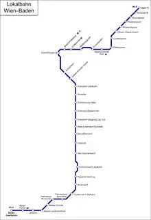 Mellem stoppestederne Wien Schedifkaplatz og Wien Oper samt Baden Viadukt og Baden Leesdorf kører banen som sporvogn i gadestrækning. På den resterende linje kører den som almindelig jernbane. Der er i alt 34 stoppesteder og stationer, hvor stoppestedet på Karlsplatz i Wien kun betjenes i retning mod Wien Oper.