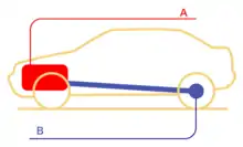 Frontmotor og baghjulstræk − A: Motor, B: Drivaksel